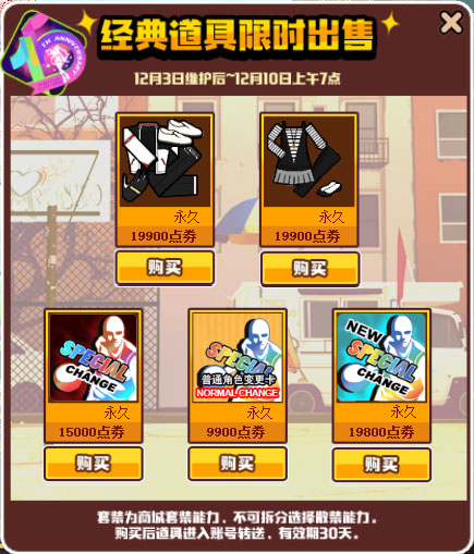 活动开启后,玩家可在活动面板购买两款经典服装道具和三种变更卡。
