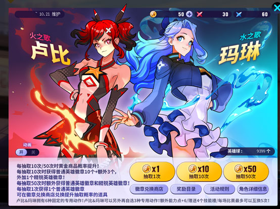 抽取道具时会获得“英雄徽章”,用于兑换道具以及新角色卢比&玛琳。