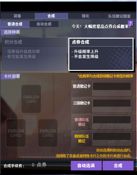 活动期间内,使用点券合成徽记卡成功率提升。