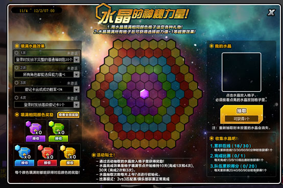 填满水晶获得的效果是格子填满节点开始维持十天(一次和四次奖励)和三十天(二次和三次奖励)。