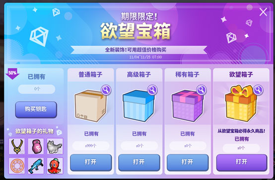 购买钥匙打开宝箱,打开宝箱有几率获得下阶段的宝箱。