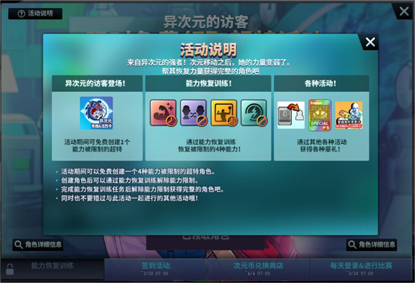 异次元世界角色再度来袭,活动期间可以免费创建一个4种能力被限制的超特角色。