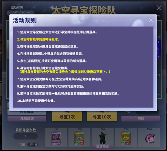 使用太空寻宝船在太空中进行寻宝并根据概率获得道具。