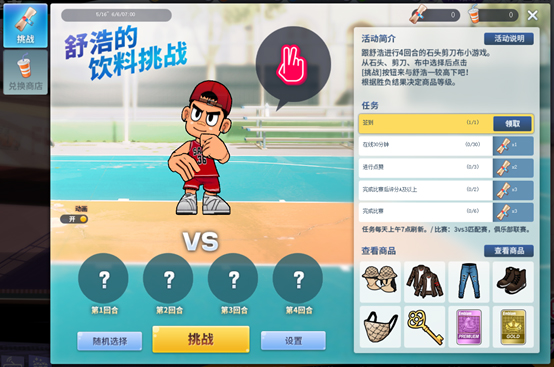 点击[设置]按钮设置4个回合的石头剪刀布后点击[挑战]按钮来挑战舒浩。