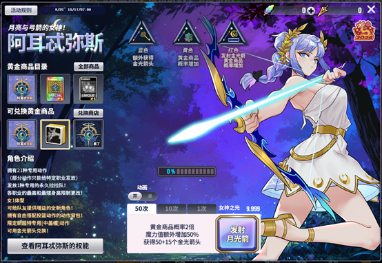 抽取道具时会获得“金光箭头”,可用于兑换道具以及新角色阿耳忒弥斯。