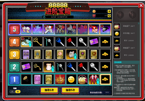 每次抽取时,可以获得一个“88888箱子”,使用“88888箱子”可以兑换各种商品。
