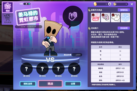 点击[设置]按钮设置4个回合的石头剪刀布后点击[挑战]按钮来挑战姜马禄。