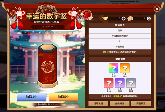 使用幸运元宝从1到20的数字中抽取1个数字。