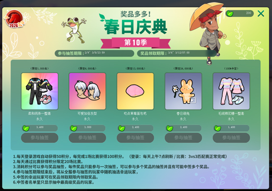 消耗春日积分可以参与奖品抽签,每件奖品只能参与一次抽签,