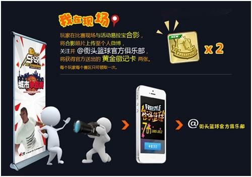 无论是参加比赛的选手,还是前去观战的玩家,只要来到比赛现场,找到 “我在现场”的活动易拉宝,合影拍照后,上传至新浪微博并@街头篮球官方俱乐部,就能获得官方送出的“黄金徽记卡”2张。