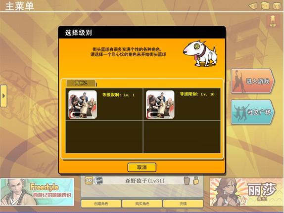 2. 玩家可以选择4个角色中的任意一个,也可通过右上角的关闭按钮不选择人物,如果选择了其中任意一个角色,并且账号内有>=31级的角色,进入等级选择界面,有1级和16级可选,否则直接进入1级角色创建界面: